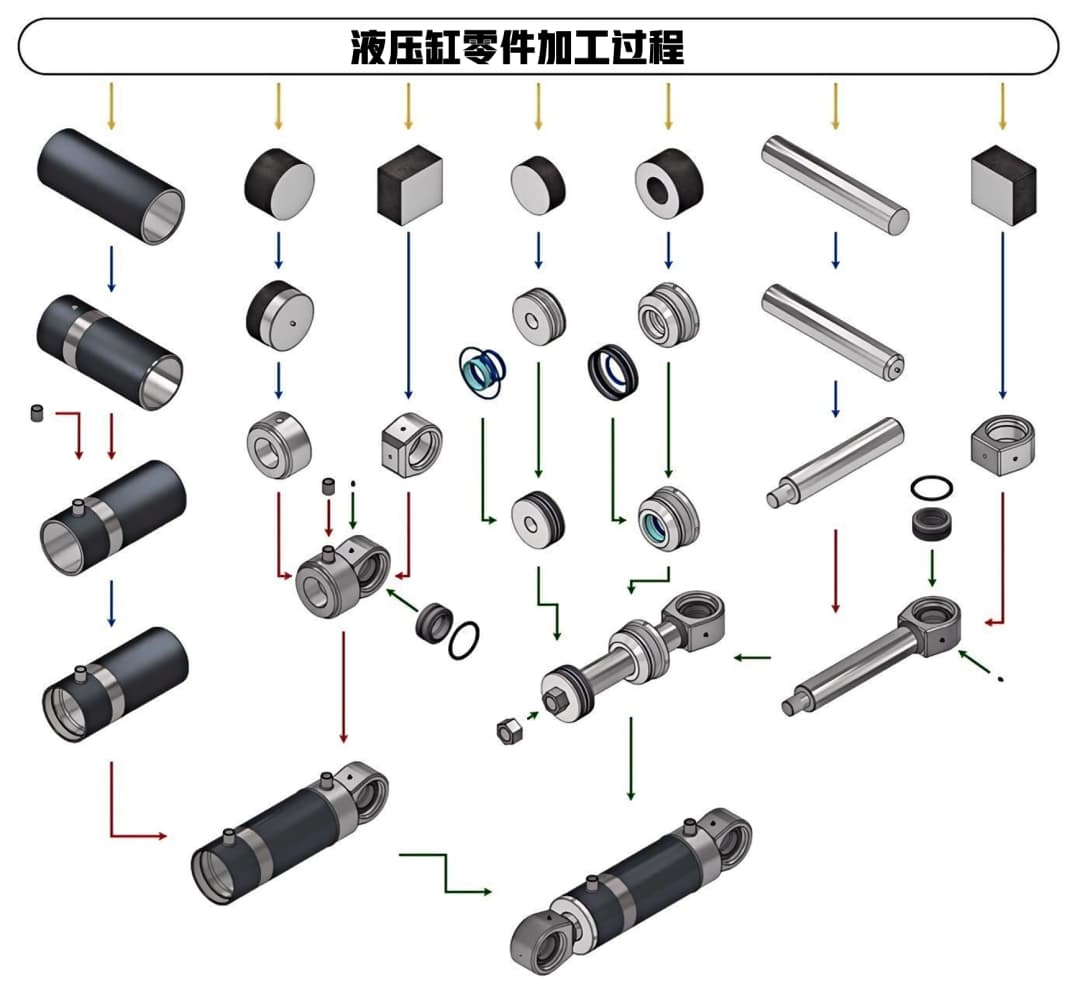 Процесс изготовления одноштокового гидроцилиндра двустороннего действия можно разделить на пять основных этапов: «Предварительная обработка сырья → Обработка основных компонентов → Сварка → Сборка → Испытания». Каждый этап требует строгого контроля параметров процесса (таких как скорость резания и подача) для предотвращения распространённых дефектов (таких как несоосность отверстий и деформация детали):